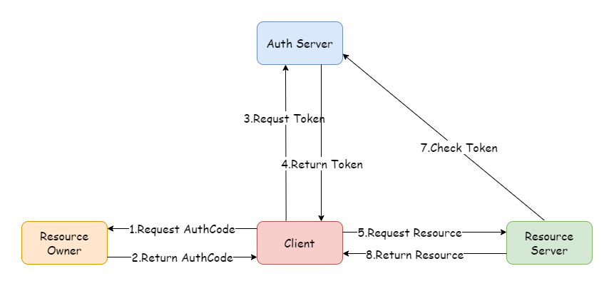 在微服务领域中,每一个服务都需要对请求验证用户身份和权限,如果和单体应用一样,每个服务都要自己实现一套认证逻辑,这显然是不太现实的。所以需要一个统一的认证与授权服务,而常见的解决方案是使用 OAuth2,分布式 Session,和 JWT,这其中,OAuth2 使用最为广泛,一度已经成为了业界标准,OAuth2 最常用的令牌类型就是是 JWT。下面是一张 OAuth2 授权码模式的流程图,基本流程如图所示。