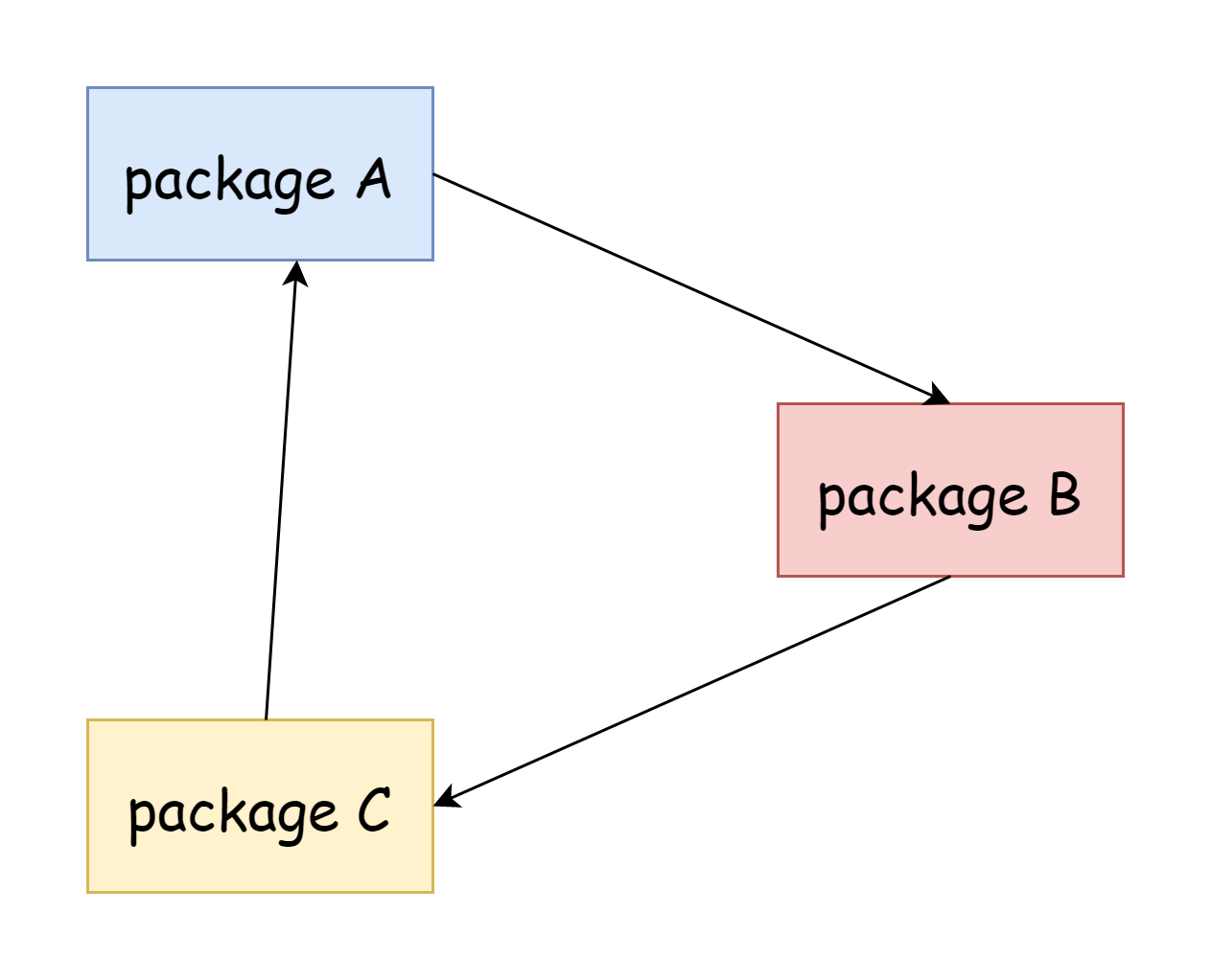 Go 中无法进行循环导入,不管是直接的还是间接的。例如包 A 导入了包 B,包 B 也导入了包 A,这是直接循环导入,包 A 导入了包 C,包 C 导入了包 B,包 B 又导入了包 A,这就是间接的循环导入,存在循环导入的话将会无法通过编译。