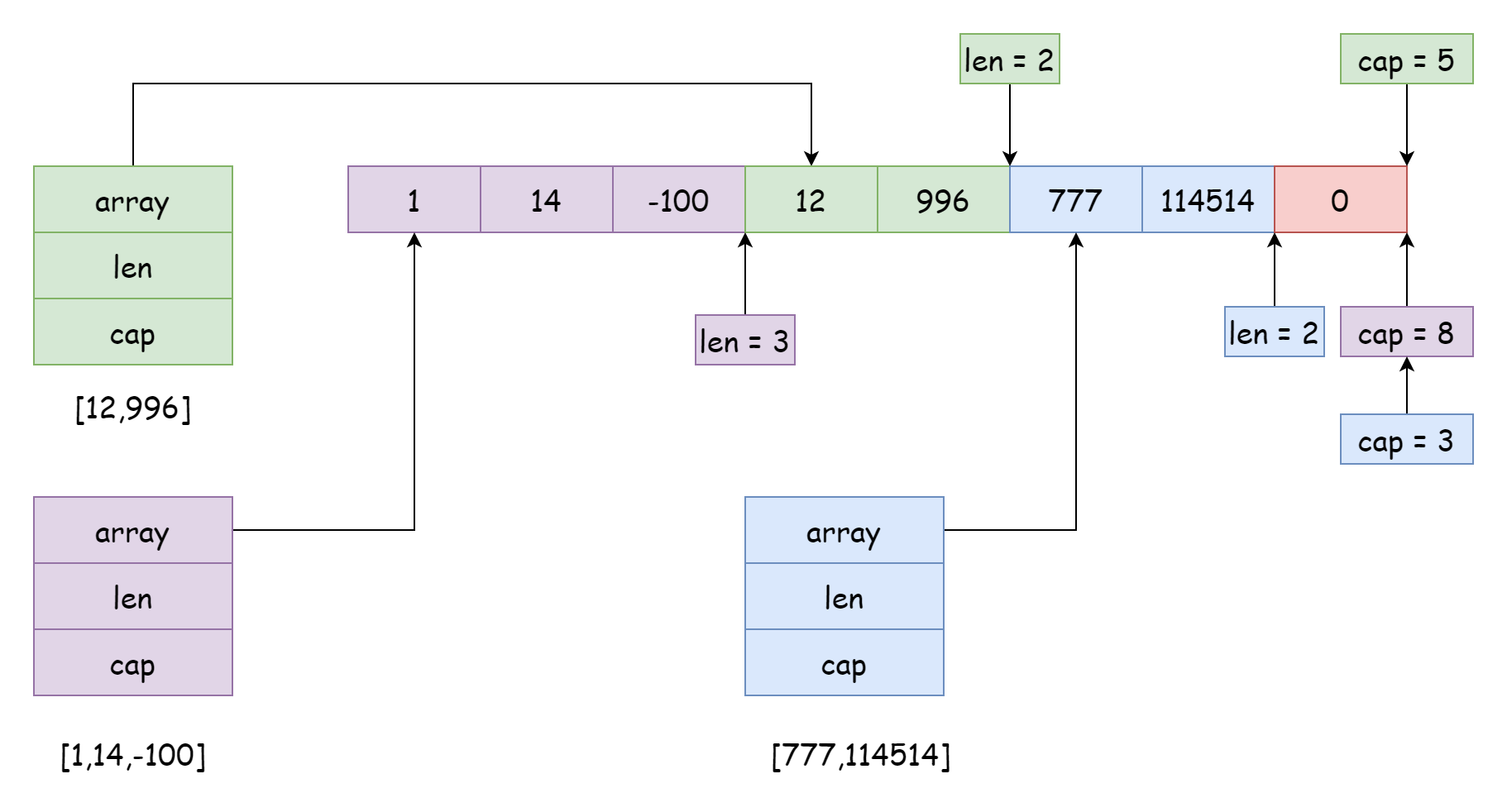 对于一个切片而言,它能访问和修改的起始位置取决于对数组的引用位置,偏移量取决于结构体中记录的长度。结构体中的指针除了可以指向开头,也可以数组的中间,就像下面这张图一样。